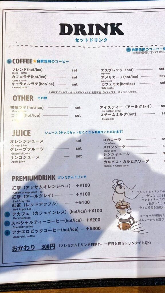 ドリンクもカフェラテ、抹茶ラテ、アイスティーなど種類がたくさん。