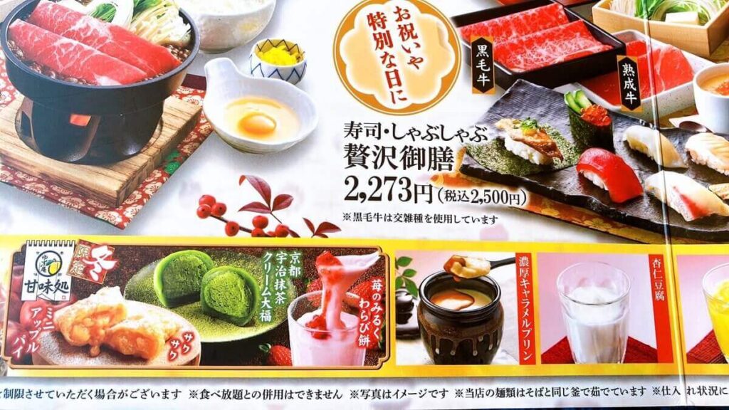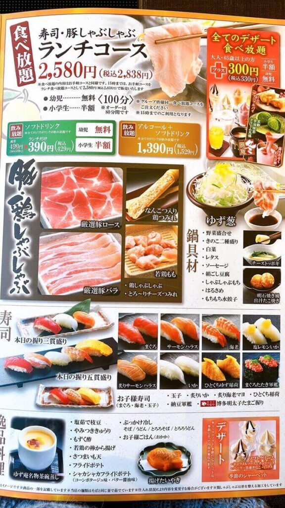 「ランチ食べ放題」は寿司・豚しゃぶの「お手軽コース」なので、たくさん食べたい人は食べ放題がオススメです。